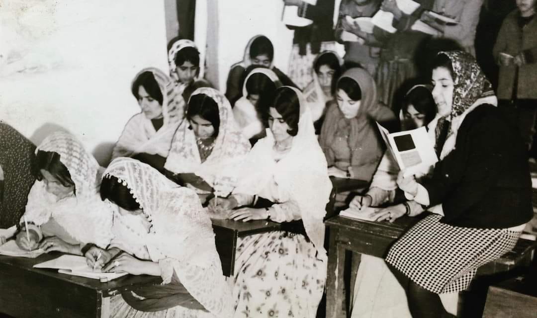 اشخاص درون عکس: از راست، رعنا خانم پنجوی همراه با دانش آموزانش