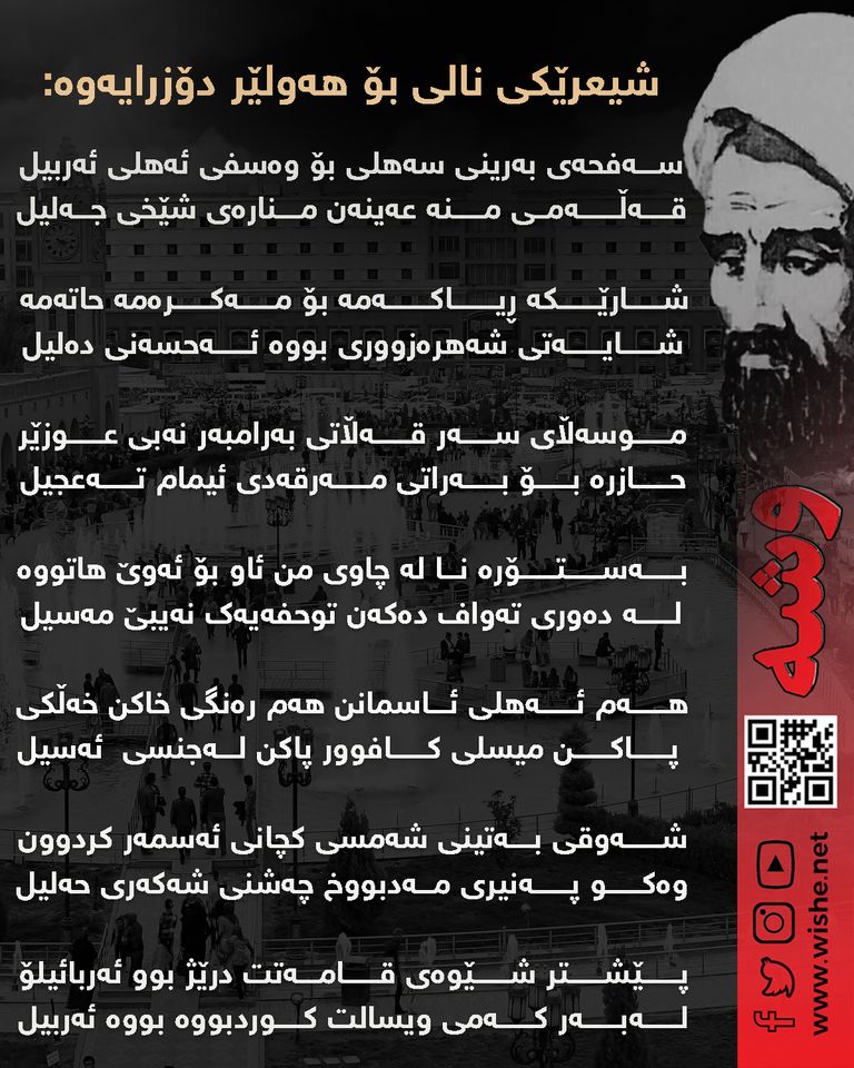 لە چەند ڕۆژی ڕابردوودا شیعرێک لە تۆڕە کۆمەڵایەتییەکان و لە وێبسیاتی وشە بڵاو بووەتەوە کە گوایە نالی لە تەمەنی بیست ساڵی هاتووە بۆ هەولێر و ئەم شیعرەی بۆ هەولێر نووسیوە.
