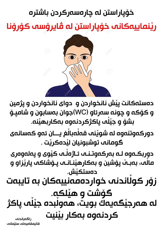 - #وەزارەتی تەندروستی# ڕێکار و داوای یاسایی لە دادگا بەرامبەر کەسێک دەگرێتەبەر کە خۆی بە پزیشک دەناسێنێی و هاوڵاتیان تووشی دڵەراوکێ، ترس و تۆقاندن دەکات لەسەر ڤایرۆسی کۆڕۆنا بەبێ هیچ بنەمایەک.[4]
