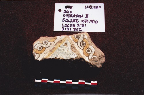 پارچەیەکی لە قوڕ دروستکراوی سورەوە کراوه، کە گوزارشت لە نەخش و نیگار و جوانکاری دەکات، لە گردی ساتوقەڵای گوندی ساتوقەڵای شارەدێی #تەقتەق# لە ساڵی 2011 دۆزراوەتەوە.