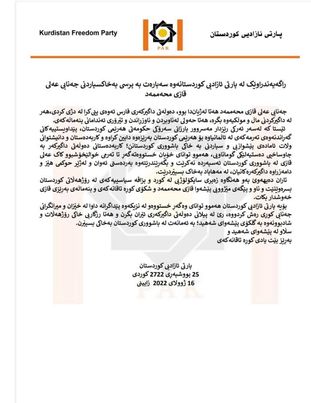 بۆیە #پارتی ئازادیی کوردستان# هەموو توانای وەگەڕ خستووە و لە نزیکەوە پێداگرانە داوا لە خێزان و میراتگرانی جەنابی کوڕی ڕەش کردووە، ڕێ لە پیلانی دەوڵەتی داگیرکەری ئێران بگرن و هەتا ڕزگاریی خاکی ڕۆژهەڵات و شادبوونەوە بە گڵکۆی پێشەوای شەهید بە ئەمانەت لە باشووری کوردستان بەخاکی بسپێرن.