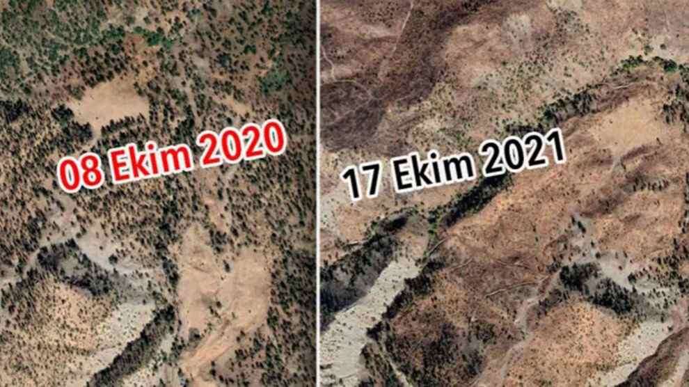 Satellitenfotos belegen die massive Zerstörung der Waldgebiete in #Nordkurdistan#. Durch Abholzung und gelegte Brände existiert auf vielen Bergen kein Wald mehr. Die Zerstörung der Natur ist Teil der türkischen Kolonial- und Kriegspolitik.