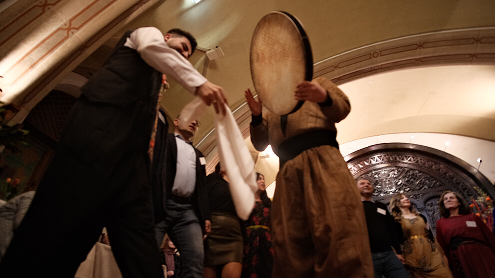 Der kurdische Künstler Hamid und sein Ensemble sorgten im Anschluss an die Reden für ein musikalisches Erlebnis mit Klängen der Def (auch Daf) und Gesang aus Rojhilat (Ostkurdistan). Der kurdische Begriff „Def“ steht für die Rahmentrommel, ein traditionelles Schlaginstrument mit einer über 4000-jährigen Geschichte, deren kulturelle Wurzeln bis nach Mesopotamien zurückreichen. Die Symbiose von individuellen Stilistiken und traditionellen Aspekten des Ensembles lud zu ausgelassenen Govend-Tänzen ein, auf die ein Auftritt des bekannten Sängers Şîvan Perwer folgte. Der Meister präsentierte, begleitet von Hamid, seinen beliebten Song „Hoy Nazê“.