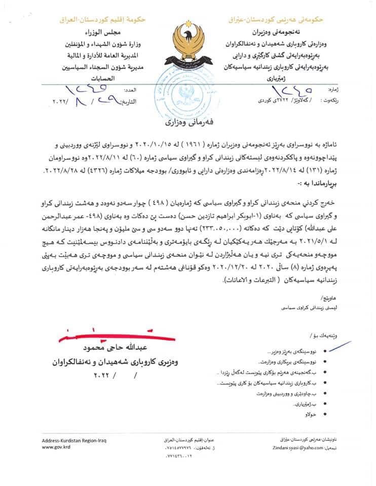 #وەزارەتی کاروباری شەهیدان و ئەنفالکراوان# لیستێکی زیندانییانی سیاسی بۆ وەرگرتنی (مینحە) مووچەی بەردەوام ڕائەگەیەنێت.