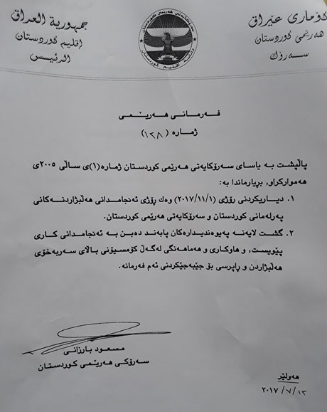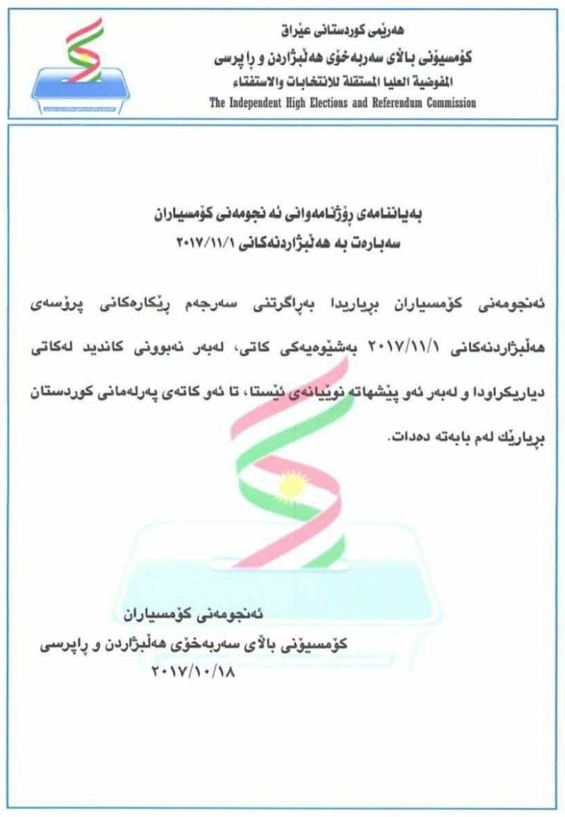 - #حەیدەر عەبادی# ڕایگەیاند، هەموو ئه و سنوورانەی لەژێر کۆنترۆڵی حکومەتی عێراقی فیدراڵدان لەلایەن حکومەتی عێراقەوە بەتەنیا بەڕێوەدەبرێن و لە هیچیاندا ئیدارەی هاوبەش نابێت لەگەڵ حکومەتی هەرێمی کوردستان.[3]