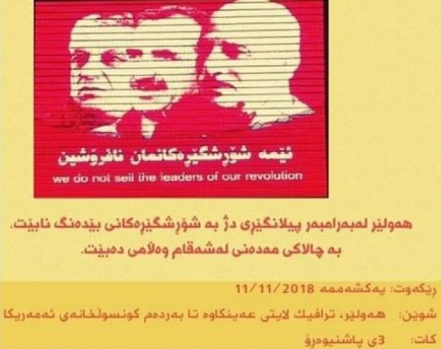 - ئەمڕۆ لە شاری #هەولێر# کۆمەلێک لەچالاکوانان، مامۆستایان، ڕۆژنامەنووسان و هاووڵاتیانی شاری هەولێر بەئامانجی ئیدانەکردنی بڕیارەکەی ئەمریکا لەدژی 3کادیرە پێشەنگەکەی پەکەکە و بە دروشمی ئێمە شۆڕشگێڕەکانمان نافرۆشین خۆپیشاندانێکیان لە بەردەم کونسوڵخانەی ئەمریکا لە عەن کاوەی شاری هەولێر ئەنجامدا.[2]=KTML_ImageCaption_Begin==KTML_StyleDiv=width:30%;height:20%;float:right;=KTML_ImageCaption_Target_Link=https://www.kurdipedia.org/files/relatedfiles/2018/156680/0009.JPG=KTML_ImageCaption_Title=هاووڵاتیانی هەولێر بڕیارەکەی ئەمریکایان ئیدانە کرد=KTML_ImageCaption_CaptionStyle=000000=KTML_ImageCaption_Caption=هاووڵاتیانی هەولێر بڕیارەکەی ئەمریکایان ئیدانە کرد=KTML_ImageCaption_End=