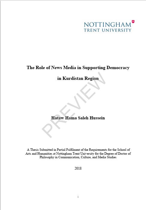 In 2018, Hataw Hamasalih as an Iraqi Kurdish media researcher has submitted his PhD thesis in partial fulfilment of the requirements of the Nottingham Trent University for the degree of Doctor of Philosophy in Communication, Culture and Media Studies. In her thesis abstract stated that: “This thesis has chosen the Kurdistan Region of Iraq as a case study to examine the media’s function in newly democratised countries. In any new transitional democracy, the media will be influenced by the new political system and they will frequently be criticised for being unable to act as a watchdog because of the close relationship with the political elites. However, there are also many other factors, such as cultural, political and economic pressures that affect the development of the media. This thesis makes an original contribution by furthering understanding of the role of the media in supporting an emerging democracy in the Kurdistan Region after 2003. It argues that there is also an assumption the news media will try to keep their independence from political dominance, and work actively to expose the political and government wrongdoings. Therefore, this thesis aims to examine the state of the news media in playing the role of watchdog and holding power to account. It also assesses the working environment for journalists in Kurdistan to see whether the general situation encourages media to the same degree as in established democratic societies. To understand the current situation of the media and how the news media take a critical stance towards political corruptions, this thesis has conducted in-depth interviews and focus group discussions. The results show that the media have demonstrated good practice in exposing corruption and malfeasance in the government. It argued that the media are present in the political scene and have performed their task as a forum for the public, providing the public with the necessary information. However, as a newly democratised country, the general environment in the political system is not helpful, for example, the executive, legislative and judicial authorities do not have enough power to play a key role in the democratic system. Various pressures on the media still exist, and the country lacks effective democratic institutions supporting the media, which are essential to build a strong democratic system. This has certainly limited the media’s ability to stand against political corruption and hold the government to account..”[1]