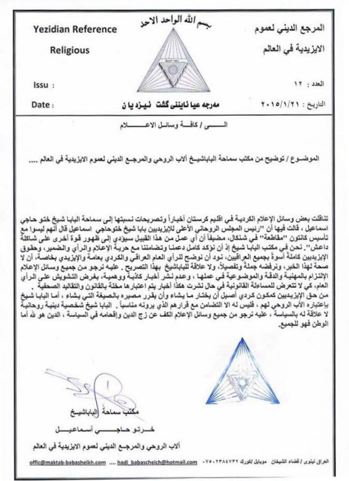 توضيح سماحة البابا شيخ بشأن تأسيس کانتون شنگال