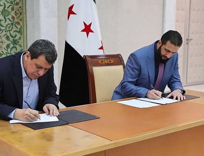 کەسایەتییەکانی ناو وێنەکە: #مەزڵوم عەبدی# و ئەحمەد شەرع سەرۆکی سووریا لە کاتی ئیمزاکردنی ڕێککەوتننامەی یەک پارچەیی خاکی سووریا.