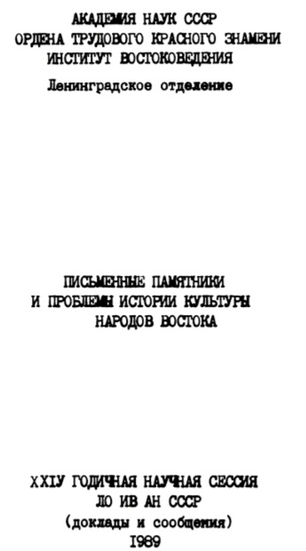 Письменные памятники и проблемы истории культуры народов Востока. XXIV годичная научная сессия ЛО ИВ АН СССР (доклады и сообщения). 1989 г. Часть 1. М.: Наука, ГРВЛ, 1991. С. 104—108.