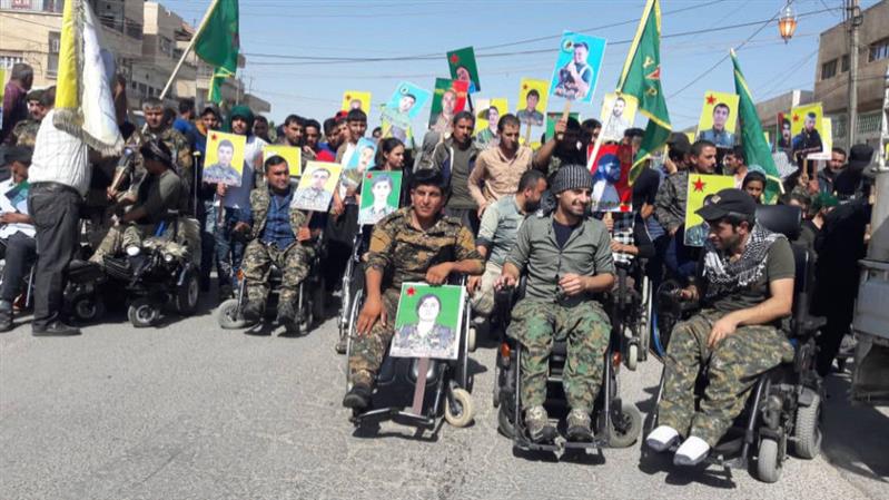 - لە شاری #قامیشلۆ#، سەدان کەمئەندام و بریندار لە یاریگەی 12ی ئازار گردبوونەوە. بریندارەکانی شەڕ هەڕەشە داگیرکارییەکانیان لە خاکەکەیان شەرمەزار کرد، کە بە جەستەی خۆیان ئەو خاکەیان لە دەست چەتەکانی #داعش# ڕزگار کرد.[4]