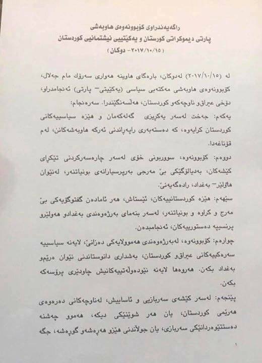 لە (15-10-2017) لە #دوکان#، بارەگای هاوینە هەواری سەرۆک #مام جەلال#، کۆبوونەوەی هاوبەشی مەکتەبی سیاسی (یەکێتی -پارتی) ئەنجامدراو، دۆخی ئێراق و ناوچەکە و کوردستان، هەڵسەنگێندرا، سەرەنجام: