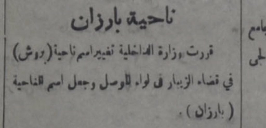 لە 07-09-1932 وەزارەتی ناوخۆی عێراق بڕیاریدا بە گۆڕینی ناوی شارەدێی (بارۆش) بۆ شارەدێی بارزان[1]