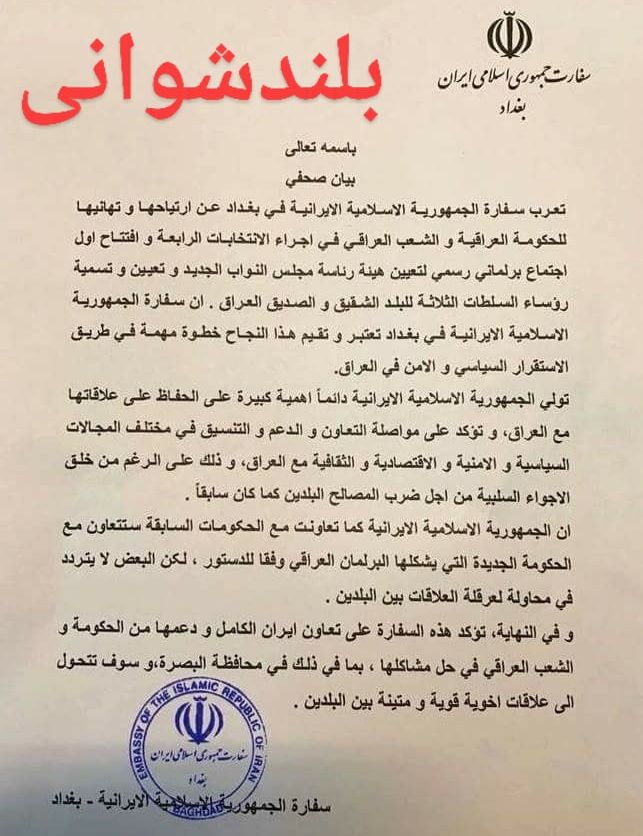 - ئەمڕۆ کاتژمێر 11:50 خولەک، بە سەرۆکایەتیی محەمەد عەلی زەینی، بەتەمەنترین پەرلەمانتاری ئەم خولە، کە لە کوتلەی سائیرونە، یەکەمین دانیشتنی خولی چوارەمی ئەنجومەنی نوێنەرانی عێراق دەستیپێکرد و لە سەرەتادا مارشی نەتەوەیی عێراق وترایەوە. لە دانیشتەکەدا، زۆربەی پەرلەمانتارە کوردەکان بەشدارییان کردووە، بەڵام پەرلەمانتارانی #بزووتنەوەی گۆڕان# بایکۆتیان کردووە.[5]