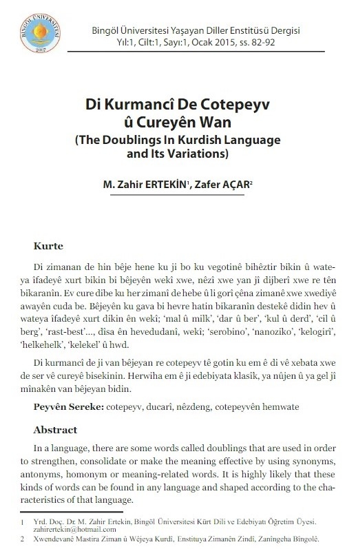 Enstîtuya Zimanên Zindî ya Zanîngeha Çewligê, Cilt:1, 2015, R. 82- 92.