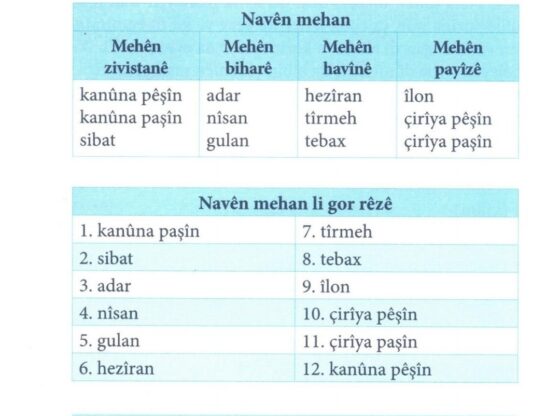 Hesenê Uso: Navên mehan gelek in, di pirtûk û ferhengan de bi awayên cuda cîh girtine. Bi ya min “pêşîn” û “paşîn” girantir dike; her mehek peyvek be çêtir e. Wek 10. Cotmeh, 11. Mijdar, 12. Kanûn, 1. Çile