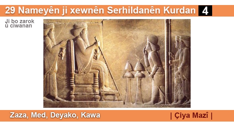Di dewr û demekêde, di salên berî zayinê de, qewmekî Arî hebû wekî me got bi navê Med. Hûn zanibin ku ev çîrok dirêj e, le ezê wekî xulase vebêjim. Îjar ev qewm ji navenda Asiya hatibûn ser axa Kurdistanê li gor gotinbêjan. Wan ji serokên xwe re digotin “Kawa”, gelek serokên wan hebûn bi vî navî. Serokê olî jî bi navê “Qerpan” dihat binavkirin. Ji xwedayekî bi navê “Homa” bawer dikirin. Dema ku hatin ser vê axê bi sê beşan bûbûn û hatibûn; kes nizane ku di navbera çend salan de, le di demek pir pir dirêj de em bibêjin. Îjar gelî cîranan beşa mezin li başûrê Kurdistanê, beşa biçûk li Azerbeycan û yên din jî nêzî Tehran li Ragesê bi cih bûne, li gor çîrokên dîrokî û li gor gotina gotinbêjên hinek dîrokzanan. Di dema serokê xwe yê bi navê Keyxusrev de pir bi hêz bûn, bi erk bûn, bi hişmet bûn. Bi sedhezaran şervanên wan hebûn. Ji wan artêjek bi heybet ava kiribûn, erd û ezman dihejandin. Li gor tê gotin jî, tîr, kevan û şûrê her şervanî hebûye. Pir dixebitîn û plan li himber dijminê xwe diafirandin. Dibêjin fenek, xapînokek şeran jî afirandibûn Medan, wekî xefikekê bû ku gelek artêj jê ditirsiyan. Dema ku şer destpê dikir artêja wan ji ber artêja dijmin direviya. Lê bêhnek din ku dijminê wan digotin ’êdî me ew têk birin’ û diketin kêfxweşiya serkeftinê, şervanên Medan bi carekê vedigeriyan û tîr li dijminê himber xwe dibarandin. Dibêjin yekî ewropî li ser wan ev peyv belav kiriye li dinyayê; Marcelinê Romayî wisa gotiye ji bo vê fenê; “Bi vê yekê tirs û xof bi ser dijminê xwe dixistin û ew têk dibirin.” Û şervanên wan serê tîrên xwe yên ku di dohn de dakirî, vêdixistin û bi kevanê berûyê davêtin. Cihê ku ew tîr lê diketin, di nava agir de dima, dema ku av lê dibû jî hê pir gur dibû ew agir.