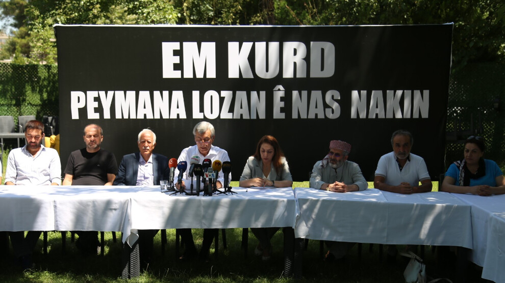 In Amed (tr. #Diyarbakir# ) haben politische Parteien und zivilgesellschaftliche Organisationen eine gemeinsame Erklärung zu dem vor hundert Jahren unterzeichneten Vertrag von Lausanne abgegeben. Die Vertreter:innen der DBP, #HDP# , Grüne Linkspartei (YSP), KKP, PIA, PSK, PDK-Türkei, Partiya Azadî, DDKD und der Plattform kurdischer Frauen forderten die Anerkennung des kurdischen Volkes und eine Entschuldigung der Vertragspartner von Lausanne.