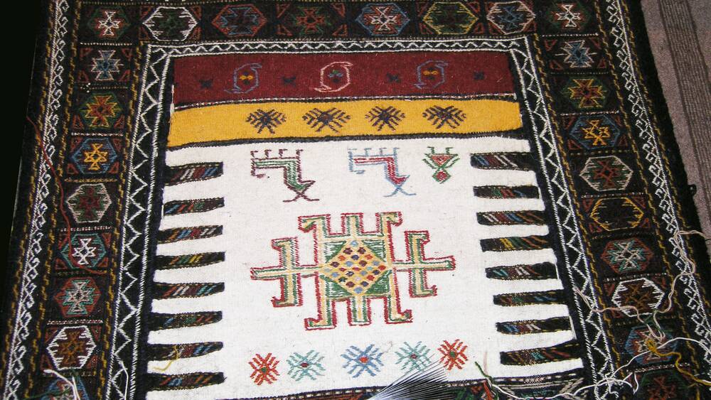 The Kurd people who inhabit northern regions of North #Khorasan# makes versatile products such as Carpets, Kilims and Jajims with elegant and original designs which have roots in their traditions and religious beliefs. Amongst the weaves of North Khorasan, “Sofreh” or blankets are regarded highly. These products are Kilims with unique unmatched decorations. It can be said that based on their design, these Kilims are one of the most different types of this handicraft. Sofreh of Kurd is a kind of needle Kilim that is weaved by Picheshi technique. This means that there are two weft yarns weaved into it. One weft is the basic and unicolor, and the second weft is colorful that creates the patterns. The most important motif of Sofreh are “Angosht” or finger, “Angosht e Arus” or finger of the bride and “Bijak”, and this is the reason these weaves are also known as Angoshti or Pishandaz Kilims.