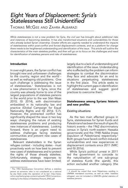 While statelessness is not a new problem for Syria, the civil war has brought about additional risks and instances of becoming stateless. It has also transformed situations and vulnerabilities for those who already lacked Syrian citizenship. Greater efforts are urgently needed to understand the impacts of statelessness within post-conflict and forced displacement contexts, and as a platform for change there needs to be heightened understanding and identification of the issue. This article will outline the characteristics of the main stateless profiles, and then will go on to focus on the challenges and need for identification of stateless persons and risks of statelessness.[1]
