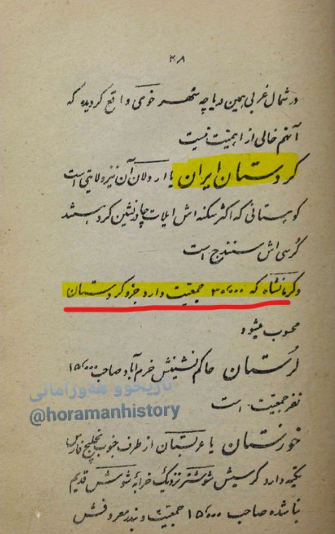 هۆرامییەکۍ بە حاڵەتی نالەباریوە پەی لاو ئېمە پەناشا ئاردەن و تکاشا ئینەنە کەدەوڵەتوو عوسمانی ناوجی بکەرۊ پەی بەدەسئاردەی بەزەیی و میهرەبان، نزیکوو ویس هەزار کەسۍ جە زاڕۊ و ژەنی ڕووبە سەرحەڎوو ئېمە مېیاو مەویەران، دەوڵەتی عوسمانی شکۊمەند گەرەکش نېیا کە ئەرکوو وەی کەردەیشا بە دەس گېرۆ، بەڵام ئەوەگېڵنای ئېڼە کەسۍ جە ژەن و زاڕۊڵۍ بۍ دەسەڵات پېچەوانەو موسڵمانی و ئینسانییەتین. جا ئەپاسە کە ئەچی ئاژەنە نمەگېڵنمېشاوە چوونکوو ویانېما هەنۍ، تکاتا وەنەم کەرمۍ کە ئەئی دوزەیە بە کەربەدەساو ئێرانی شکۊمەندی بېیاوندۍ و چەنی ئانەیچە تکاو لاڵەو دۊسانەشا پەی بکەردۍ، ئەئینەیچە پەنە زیاڎ بکەردۍ کە ئەر کریۊ و ئی تاوانەو هۆرامییەکا کە ئەنجامشا دان وەشبییە و ڕزایەتوو جەنابوو شای بەدەس بارۊ، ئانەنە کە بە تایبەتی دەوڵەتی شکۊمەند منەتدار مەبۊ و منەت منیەیدۍ سەرما، تکاتا وەنە مەکەرمۍ کە جواب دریۊوەو بکیاندېشوە پەی بەغڎای.
