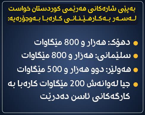 ئومێد ئەحمەد، بەڕێوەبەری گشتیی کۆنترۆڵی کارەبای هەرێمی کوردستان بە تۆڕی میدیایی ڕووداوی ڕاگەیاند لە 20-12-2018ەوە بەهۆی نزبوونەوەی پلەی گەرما، خواستی هاونیشمانییان لەسەر کارەبا بۆ دووهێندە زیادیکردووە. لە خراپترین دۆخدا ڕۆژانە هەشت کاژێر کارەبا و لەکاتی دیکەشدا 13 کاژێر کارەبای نیشتمانی دراوەتە هاونیشتمانییان، بەڵام ئێستا بەهۆی زۆری خواست لەسەر بەکارهێنانی، 10 بۆ 11 کاژێر کارەبا بە هاونیشتمانییان دەدرێت.
