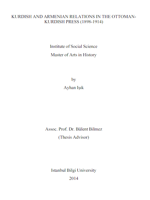 This thesis will focus on two Kurdish newspapers, two journals and one pamphlet from the late Ottoman period and their writers‘ approaches about Armenians. First of all the thesis will discuss the issues of collective identity and multiple identities in the empire and the process of formation of the Kurdish identity in that era, as collective belonging (the consciousness of being a different group had started in the late empire from the 1880s to the end of WWI). In my thesis I will mention that the proto-Kurdish nationalism initially began against Armenians then it rose up against the Ottoman Empire and Turkish nationalism. [1]