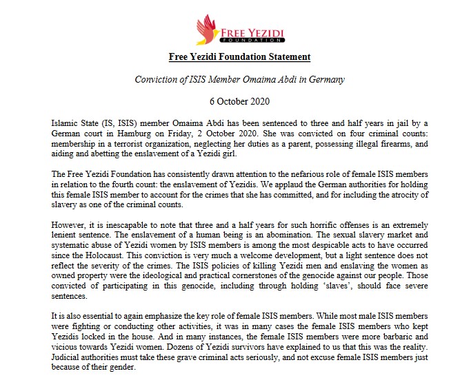 The Free Yezidi Foundation has consistently drawn attention to the nefarious role of female ISIS members in relation to the fourth count: the enslavement of Yezidis. We applaud the German authorities for holding this female ISIS member to account for the crimes that she has committed, and for including the atrocity of slavery as one of the criminal counts.