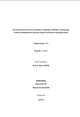 TÜBİTAK 1001 SOBAG Programı çerçevesinde desteklenen 112K397 kodlu ve “#Kürt# Seçmenlerin Oy Verme Dinamikleri: Kuzeydoğu- Ortadoğu ve Güneydoğu Anadolu Alt Bölgelerinde Seçmenin Siyasal Tercihlerinin Sosyolojik Analizi ” başlıklı bu araştırma projesi Prof. Dr. Mesut YEĞEN yürütücülüğünde gerçekleştirilmiştir. Dr. Uğraş Ulaş TOL, Mehmet Ali ÇALIŞKAN, Kadir BEYAZTAŞ, Saygın Vedat ALKURT, Esra ATALAY ve Melek ÖZMÜŞ projede yer alan ve katkı sağlayan diğer isimlerdir. 15.05.2013 tarihinde başlayan ve 18 ay olarak öngörülen proje 4 aylık ek süre alınmasıyla beraber 15.05.2015 tarihinde bitirilmiş ve nihai rapor TÜBİTAK’ın ilgili birimlerine teslim edilmiştir. Bu kapsamda araştırma ekibi destek sunan TÜBİTAK SOBAG Programı’na teşekkürlerini sunar.[1]