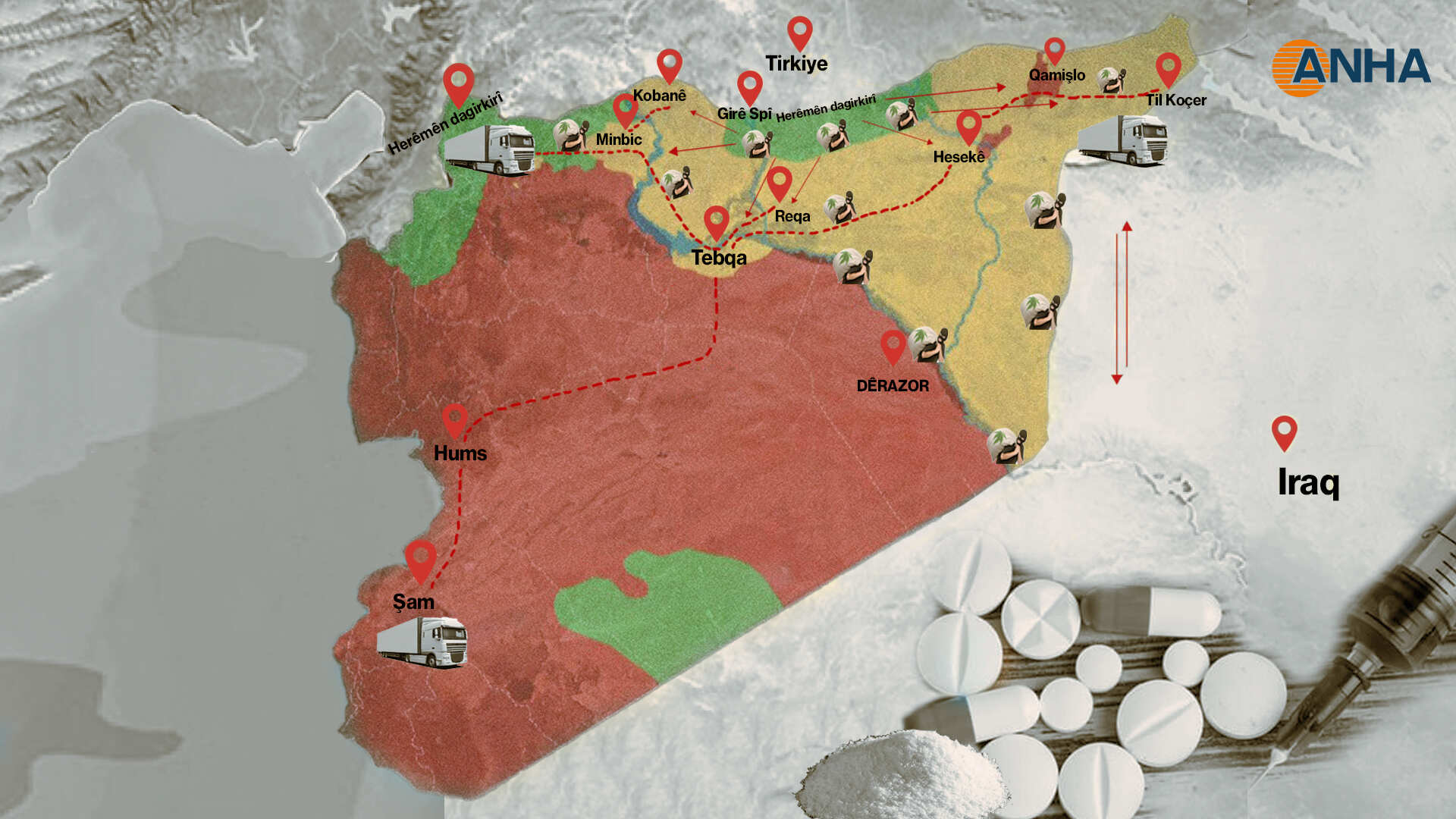 Türk devleti İdlib, Ezaz, Cerablus, Bab, Efrîn, Girê Sipî ve Serêkaniyê’yi işgal ettikten sonra uyuşturucu maddelerin geçişleri arttı. Bu bölgeler artık uyuşturucu ticaretinin koridoru haline geldi. Dahası uyuşturucu yapılan fabrikalar kuruldu ve Türk devleti bu maddeleri Özerk Yönetim bölgelerine geçirmeye çalışıyor.
