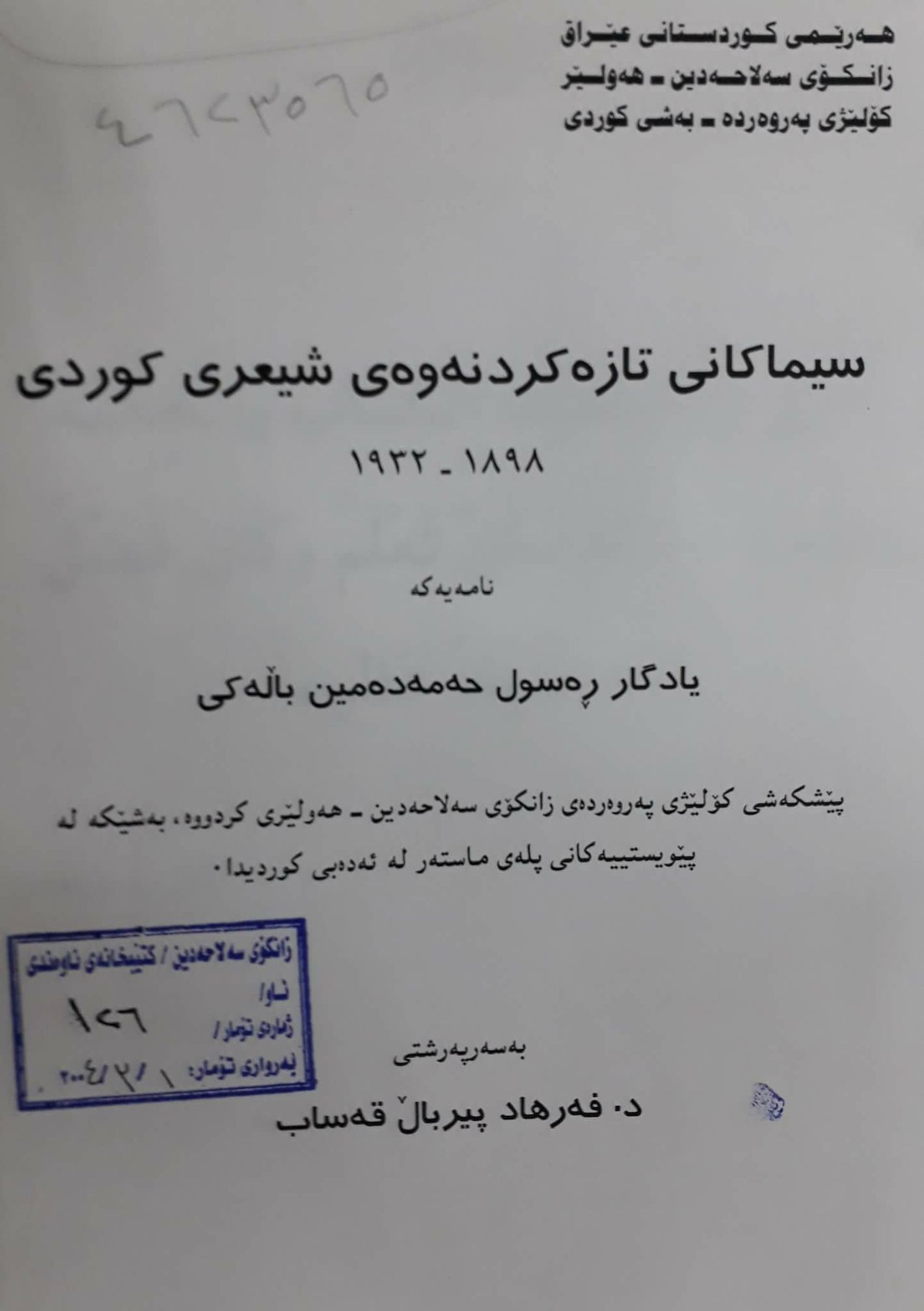 کوردیپێدیا بەهیچ جۆرێک، هیچ پەڕتووکێک لە کاغەزەوە دیجیتایز ناکات، هەر پەڕتووکێک لەم پەڕتووکخانەیەدا لەلایەن کەس و رێکخراوانی سێیەمەوە دیجیتایز کراوە و کوردیپێدیاش وەریگرتووە یان لە خاوەنەکەیەوە بۆمان نێردراوە.. تکایە ئاگاداربن. For your attention please, Kurdipedia is not digitizing any work, all our books and documents in this library are digitized by third parties (persons or organizations), most of our books are provided by their owners, thank you.