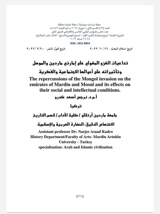 تداعيات الغزو المغولي على إمارتي ماردين والموصل وتأثيراته على أحوالها الاجتماعية والفكرية